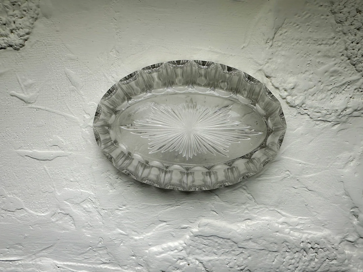 Featuring a unique clamshell-inspired scalloped edge, this bowl mimics the delicate ruffles of a blooming flower, adding a touch of nature's finesse to your home decor. The intricate sunburst pattern at the base of the bowl, visible from a bird's-eye view, invites the eye to a dance of light and shadow, creating a captivating focal point for any room.